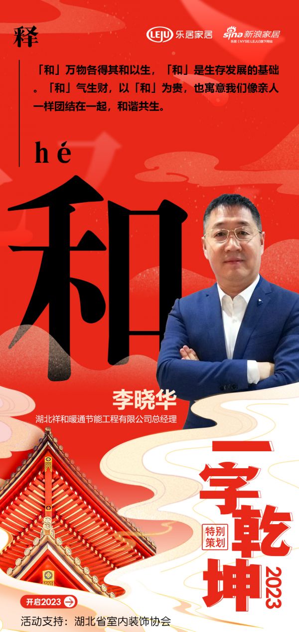 在新浪家居“2023一字乾坤”活动中,湖北祥和暖通节能工程有限公司总经理李晓华:「和」万物各得其和以生,「和」是生存发展的基础。「和」气生财,以「和」为贵,也寓意我们像亲人一样团结在一起,和谐共生。