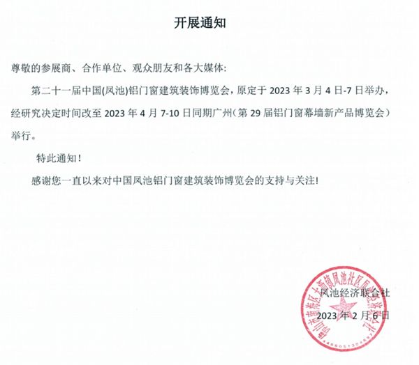 门窗快讯|第二十一届中国(凤池)铝门窗建筑装饰博览会延期