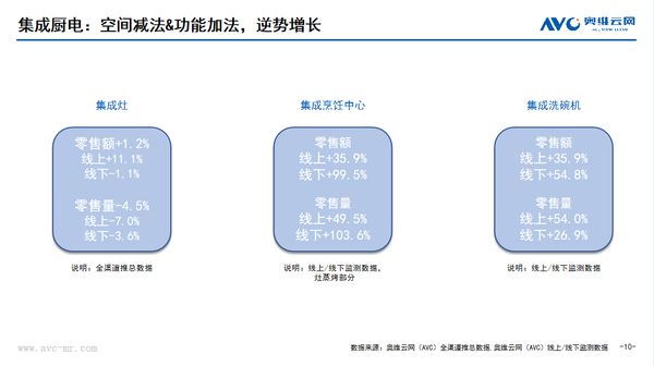 集成灶和集成洗碗机可谓是现阶段厨房套系CP里的佼佼者,他们在各自的赛道上熠熠生辉。据奥维云网(AVC)数据显示,2022年集成灶全渠道零售额规模达259亿元,同比增长1.2%,近3年复合增长率23.5%,今年有望破300亿;2022年集成洗碗机线上市场零售量、零售额分别同比增长54.0%、35.9%,线下市场零售量、零售额分别同比增长26.9%、54.8%。在疫情、房地产等因素导致的市场下行环境下,逆势而上,发展态势良好,相信他们的组合,也会同样出彩,做到1+1>2。