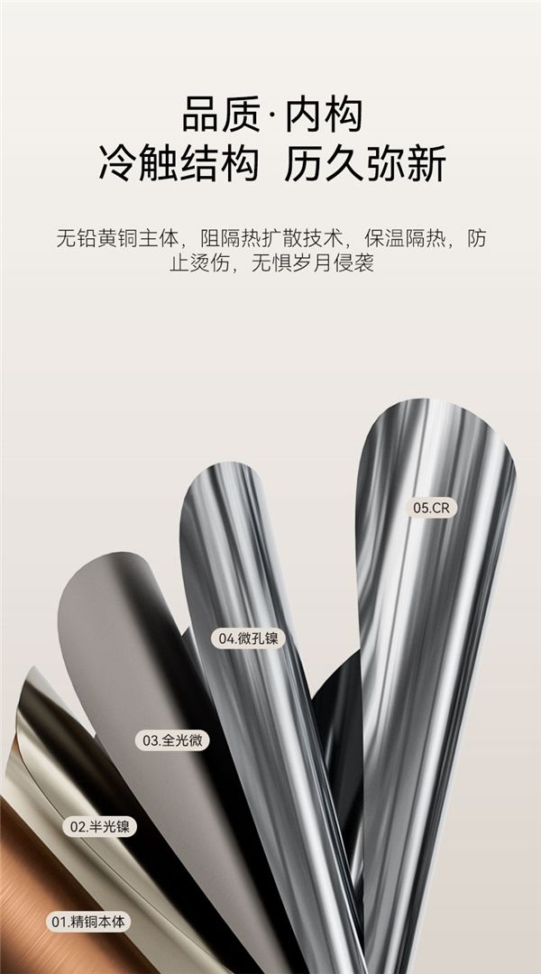 阀芯主体采用黄铜材质,利用阻隔热扩散技术,保温隔热,防止烫伤,无惧岁月侵袭。