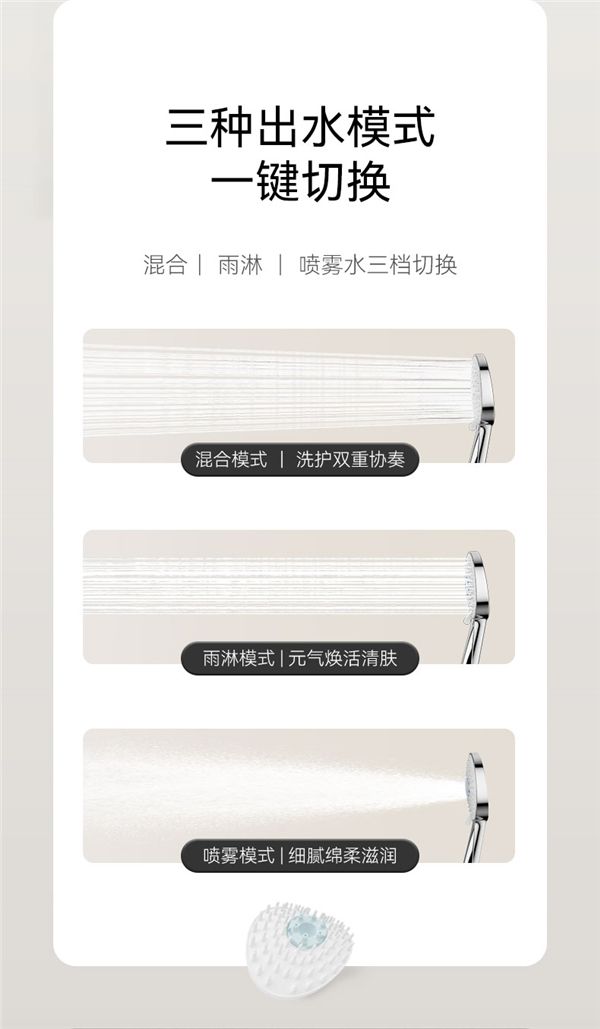手持花洒配备健康硅胶出水口,同时蕴含三种出水模式:混合、雨淋、喷雾水,拨动即可切换,轻拨即可排出余水。无论是水疗按摩,还是深度清洗,弹性硅胶水嘴都能保证出水流畅,安全健康。