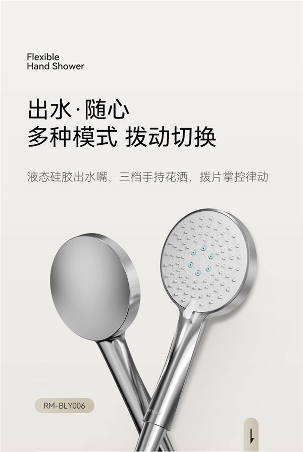 REMO瑞摩以抽离繁杂欲望为设计理念,悉心研发两功能淋浴套装:三档手持花洒辅以手帖滑座与防爆抗压软管,带来舒爽简约的沐浴体验。