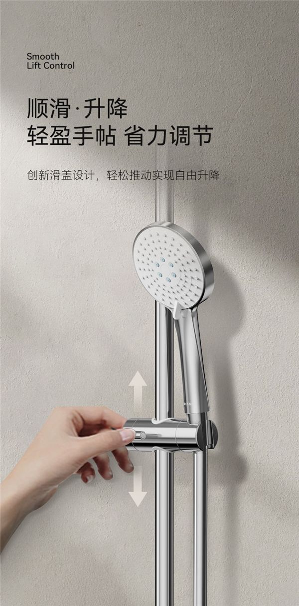 系列标配的手帖花洒插座,采用创新滑盖设计,单指轻松推动,实现自由升降。