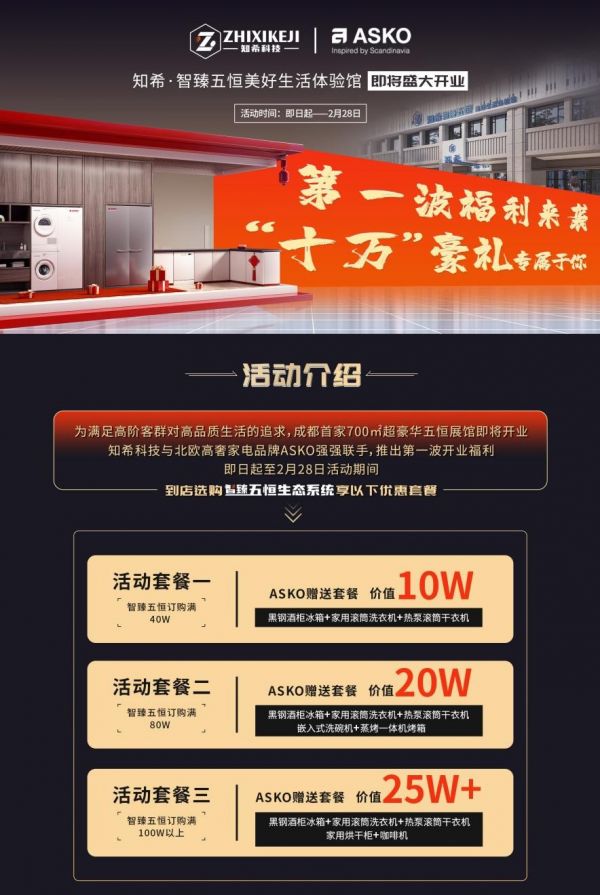 同时,为了满足高阶客群对未来生活质感的追求,知希科技与北欧高奢家电品牌ASKO强强联手。在2023年2月1日—2月28日期间,知希科技推出第一波重磅福利活动!