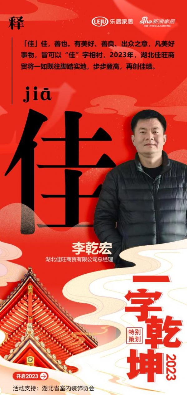 在新浪家居“2023一字乾坤”活动中,湖北佳旺商贸有限公司总经理李乾宏:「佳」佳,善也。有美好、善良、出众之意,凡美好事物,皆可以“佳”字相衬,2023年,湖北佳旺商贸将一如既往脚踏实地,步步登高,再创佳绩。