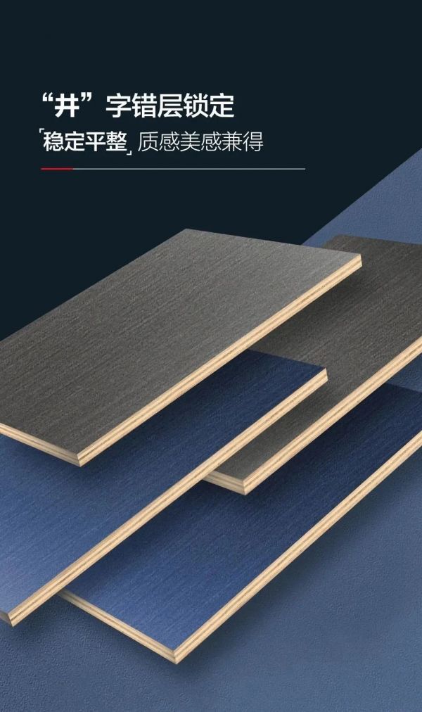 产品上下表层采用科技木皮压贴,板面平整度好、整体结构均匀稳定,抗变性能佳,有利于表层饰面美观和家具实木质感的体验发挥。