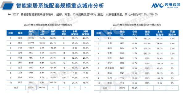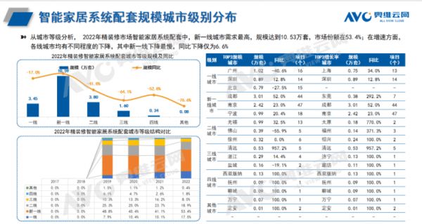 2022年精装修市场智能家居系统、智能开关、智能门锁配套项目中,华东市场为主力,华东市场份额也在逐年上涨,新一线城市需求最高。2022年精装修智能家居系统市场中,成都、南京、广州规模位居TOP3,清远、太原增速明显,同比分别为957.2%、770.0%。2022年精装修智能开关市场中,广州、成都、南京规模位居TOP3;济南、杭州增速明显,同比分别为293.5%、234.4%。2022年精装修智能门锁市场中,广州、杭州、上海规模位居TOP3;西双版纳、东方增速明显,同比分别为247.6%、176.5%。