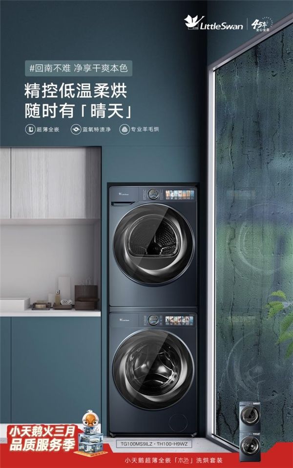 为了解决“回南天”衣物无法晾干、细菌滋生难题,小天鹅超薄全嵌本色洗烘套装,具备专业烘护能力和洁净灭菌、除味效果,助你轻松解决衣物洗护烦恼。在这冬春交替的时节,很多家庭都有大量的冬季衣物要换洗护理,尤其是羊毛织物,更需要贴心护理。而该烘干机获国际羊毛蓝标认证,针对羊毛面料,采用正反贴壁柔烘,让羊毛衣物蓬松柔软不打卷,衣物烘干更加均匀。同时双重精准控温功能,有效避免衣物热损伤、过烘变形,即便是遭遇潮湿的“回南天”天气,也能轻松实现贴心的专业护理。