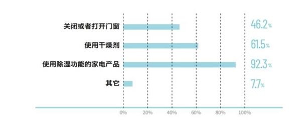据消费者对防潮除菌调查显示,有92.3%的消费者会选择带有防潮、除菌、烘干功能的家电产品,同时有61.5%的消费者表示会使用干燥剂,另计超过45%的消费者会选择关闭或者打开门窗应对潮湿环境。