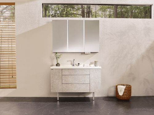 同样的还有松下浴室柜,松下的浴室柜有三个显著特点,不需要手伸到面盆底部去按压排水,只要操作台面上的按钮就能实现排水,更方便也更卫生;同时,面盆和台面做了一体化设计,更便于清洁;另外,松下照明产品的技术优势也在浴室镜柜上得到了很好的运用,松下浴室柜不仅同时兼备nanoeX(纳诺怡)除菌与充电功能,其镜面上的照明更是有自然光、冷光、暖光三种色温可调以及电加热除雾功能,可满足女性日常化妆对于灯光镜面的要求。