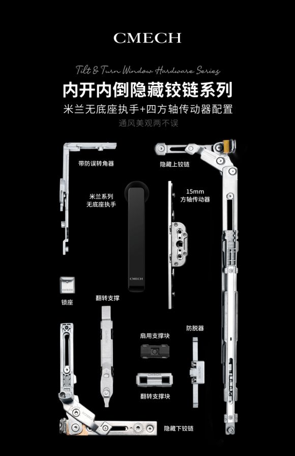 CMECH希美克内开内倒窗五金系统整体采用优质环保高强度的原材料,质量稳定可靠。同时,性能出色,经过严苛检测,十年质保,品质有保障。
