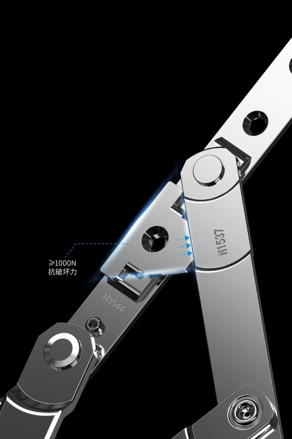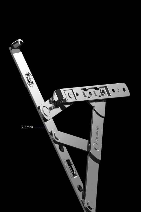 铰链是外开窗纱门窗系统必不可少且十分重要的配件,起着支撑门窗以及实现门窗启闭的功能。CMECH希美克这套外开窗纱一体L系列门窗五金系统为提升加强铰链的硬度和性能,将其底板加厚至2.5mm,主承重杆件也选用了厚度达到4mm的优质304不锈钢去制作。铰链还独有抗强风青蛙头专利设计+抗强风压专利设计,能提供超过1000N的开启角度限制力量,极大提高安全性。铰链还形成以预挂钩、加持块与螺丝孔共同受力的三重安全连接结构设计,门窗安全更有保障。