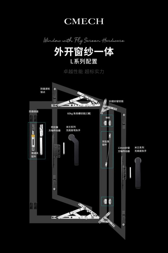 窗纱一体窗在防蚊虫的同时还可以起到一定的防盗效果,所以也更加安全。最近,CMECH希美克新品外开窗纱一体L系列就以其出众的性能出圈,这套外开窗纱一体L系列门窗五金系统采用的是曾经获得德国红点设计奖的米兰系列执手,强度高且更耐磨,独特的“铁三角”螺丝结构的设计保证执手更加牢固,寿命更长。