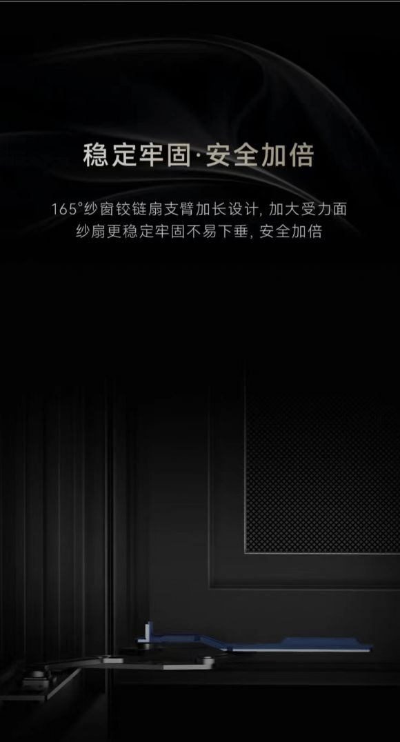 另外外开窗纱一体L系列门窗采用的165度纱窗铰链,其主受力臂厚度达到了2.5mm,铰链扇支臂更采用了加长设计,加大受力面,使纱扇更加稳定牢固不易下垂。