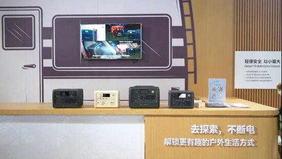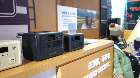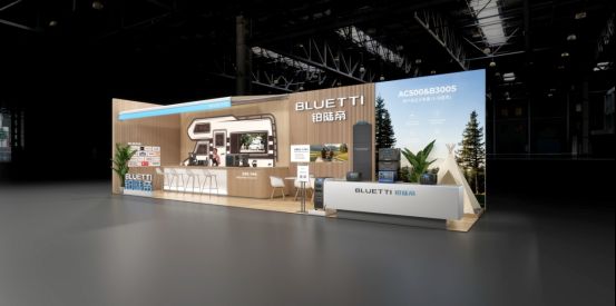 BLUETTI铂陆帝展位整体采用了贴近大自然的原木色搭配,在展厅主要展示墙加入了房车元素,让使用场景与产品更加贴近融合,同时在右侧加入户外元素、搭建真实帐篷区,使大家可以身临其境般体验户外露营用电的乐趣。