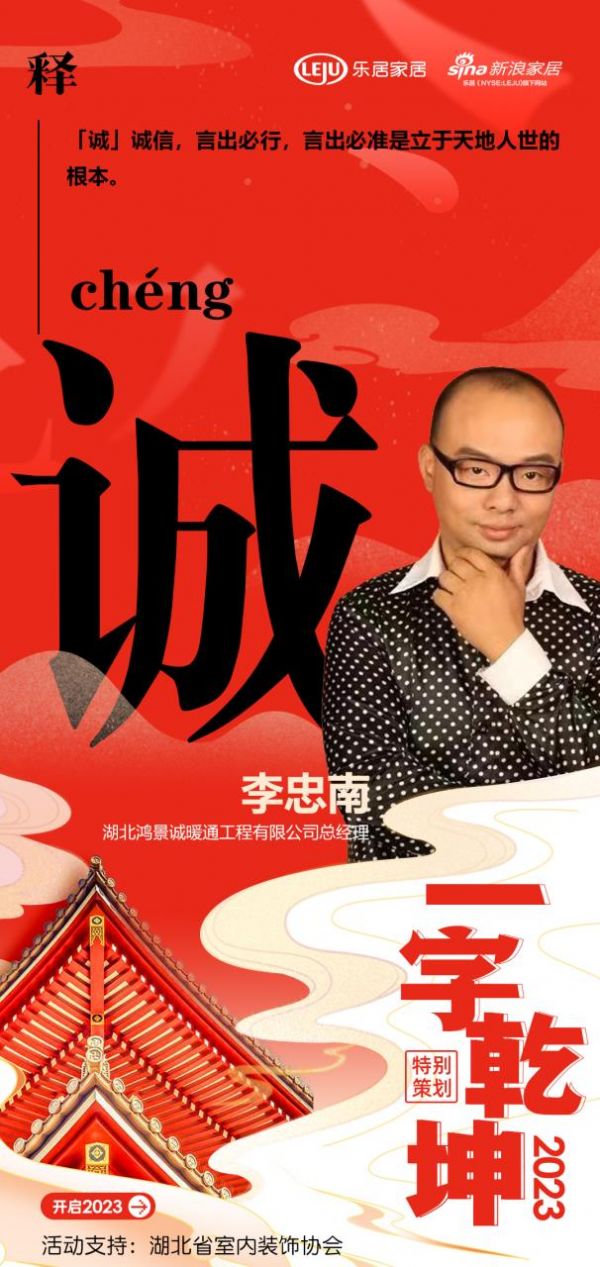 在新浪家居“2023一字乾坤”活动中,湖北鸿景诚暖通工程有限公司总经理李忠南:「诚」诚信,言出必行,言出必准是立于天地人世的根本。