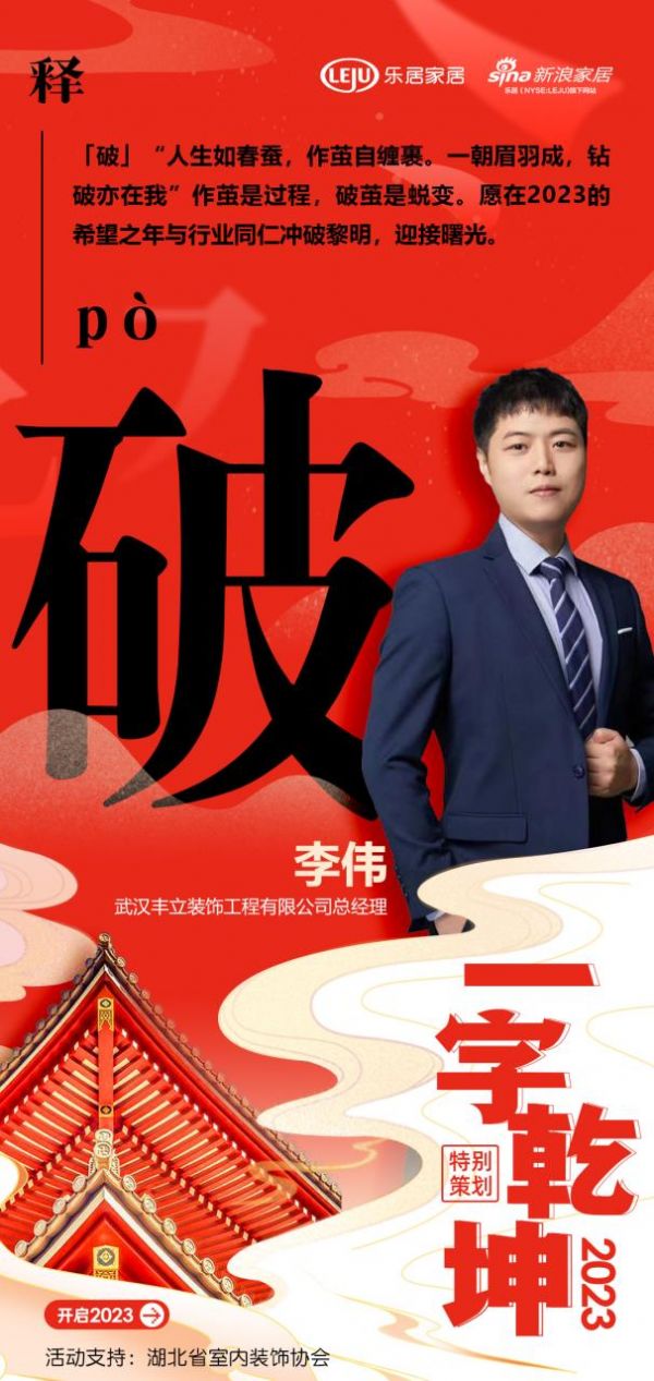 在新浪家居“2023一字乾坤”活动中,武汉丰立装饰工程有限公司总经理李伟:「破」“人生如春蚕,作茧自缠裹。一朝眉羽成,钻破亦在我”作茧是过程,破茧是蜕变。愿在2023的希望之年与行业同仁冲破黎明,迎接曙光。