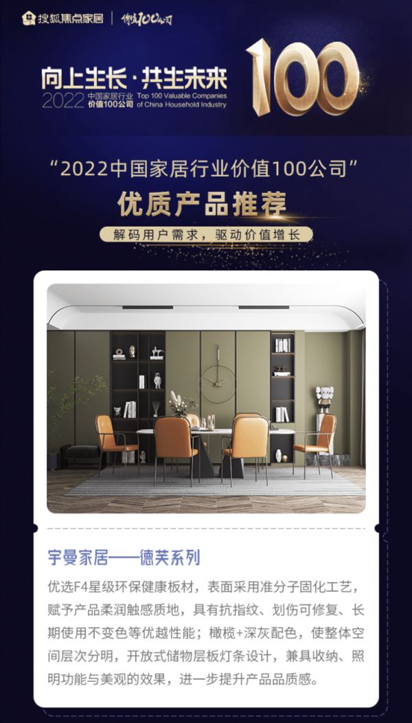 “2022中国家居行业价值100公司”近期重磅发布!凭借市场、创新、财务和社会贡献等综合实力的表现,包括宇曼家居在内的百家品牌企业荣获“2022中国家居行业价值100公司”!