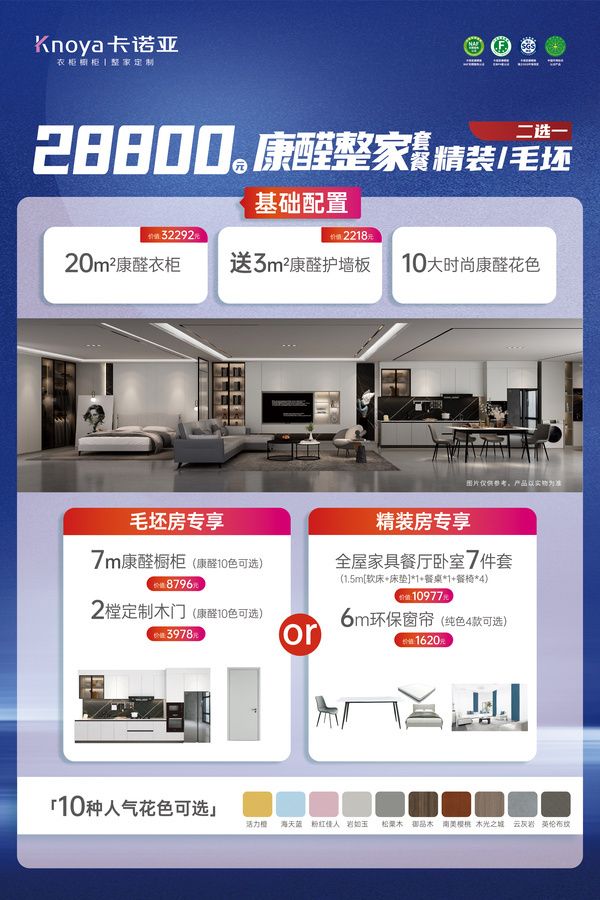 28800元康醛整家套餐=20㎡康醛定制柜+7m康醛橱柜+2樘定制木门(毛坯房专享)或20㎡康醛定制柜+餐厅卧室7件套+6m窗帘(精装房专享),再送3㎡背景墙,全屋标配健康环保“康醛板”,花色再次升级为10大人气花色,一个套餐即能将柜、墙、门等产品一站配齐,真正实现“一家搞定,拎包入住,省钱省心”。