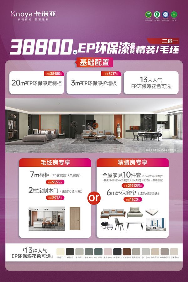 本次大促,除了热销多年的28800元康醛整家套餐,还重磅推出38800元EP环保漆整家套餐,分别针对毛坯房和精装房配置了不同的套餐内容,买套餐送3㎡EP漆背景墙,定制柜柜门与背景墙拥有13大EP环保漆花色可供自由选,同样将柜墙门一体化理念贯穿到整家套餐之中,让消费者买得实惠、装得省心、住得舒适!