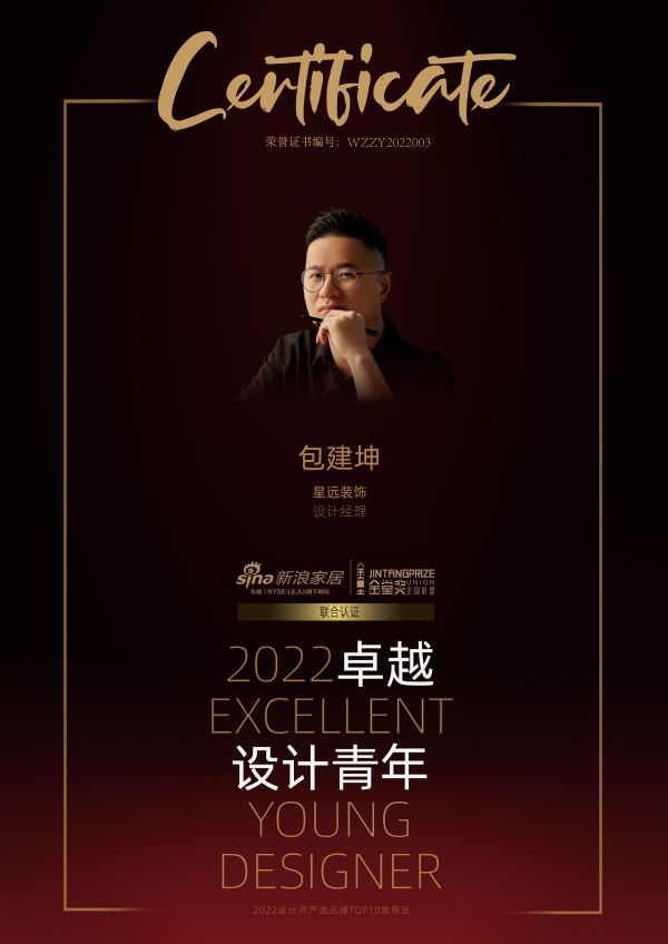 近年来,中国设计已经不是之前的盲从者,一批又一批优秀的青年设计师,用现代设计语言表达着中国当代新人居,诠释着中国人现有的生活审美和品位。中国设计的青年力量,已经完成了自我突破的变革期。转变为引领中国生活方式和设计潮流的先锋倡导者——“2022卓越设计青年”。由新浪家居和金堂奖全国联盟发起,是设计业界最具传播价值的年度先锋荣誉,其成员全国设计领域青年精英设计师组成,新浪家居与金堂奖联名认证。本次活动致力于在全国范围内发掘和表彰室内设计领域表现卓越的杰出青年设计师,为推动中国设计中坚力量,中国设计新影响力而努力。