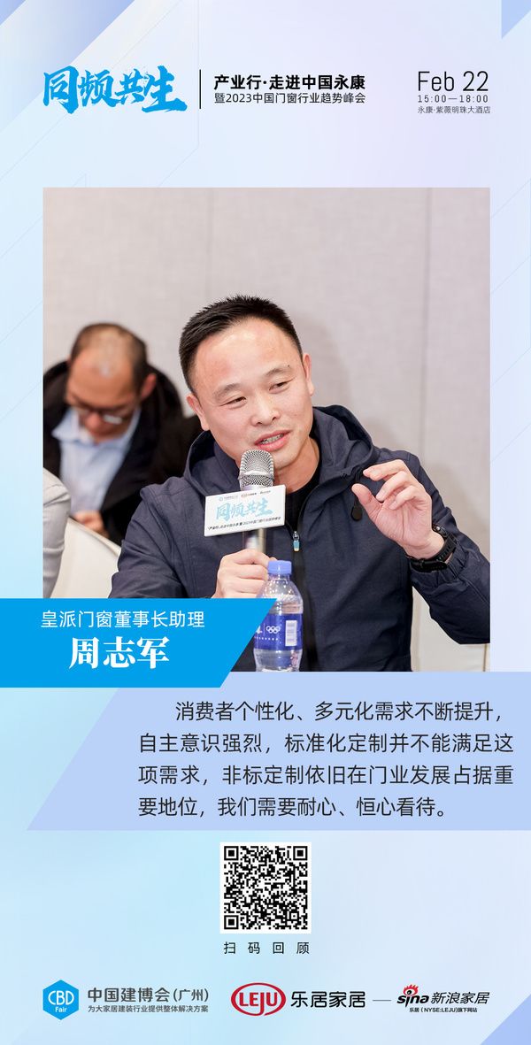 皇派门窗董事长助理周志军:消费者个性化、多元化需求不断提升,自主意识强烈,标准化定制并不能满足这项需求,非标定制依旧在门业发展占据重要地位,我们需要耐心、恒心看待。