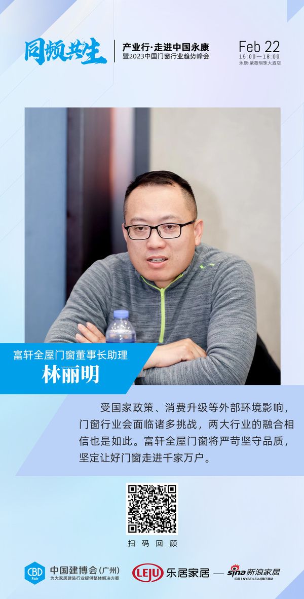富轩全屋门窗董事长助理林丽明:受国家政策、消费升级等外部环境影响,门窗行业会面临诸多挑战,两大行业的融合相信也是如此。富轩全屋门窗将严苛坚守品质,坚定让好门窗走进千家万户。