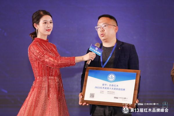 古森红木荣获“2022阔叶黄檀家具热门品牌”(右二)