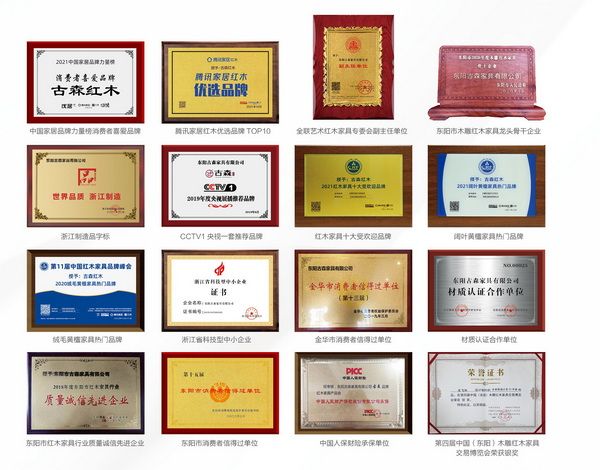 从入选“浙江制造品字标”、“东阳市木雕红木家具龙头骨干企业”“腾讯家居红木优选品牌”、“全网十大口碑红木品牌”等荣誉,再到入选“大国匠心品牌”、“红木家具十大受欢迎品牌”、“阔叶黄檀家具热门品牌”,每一个奖项都是行业与消费者对古森红木的认可,而每一份认可也让古森红木获得更多的发展动力。