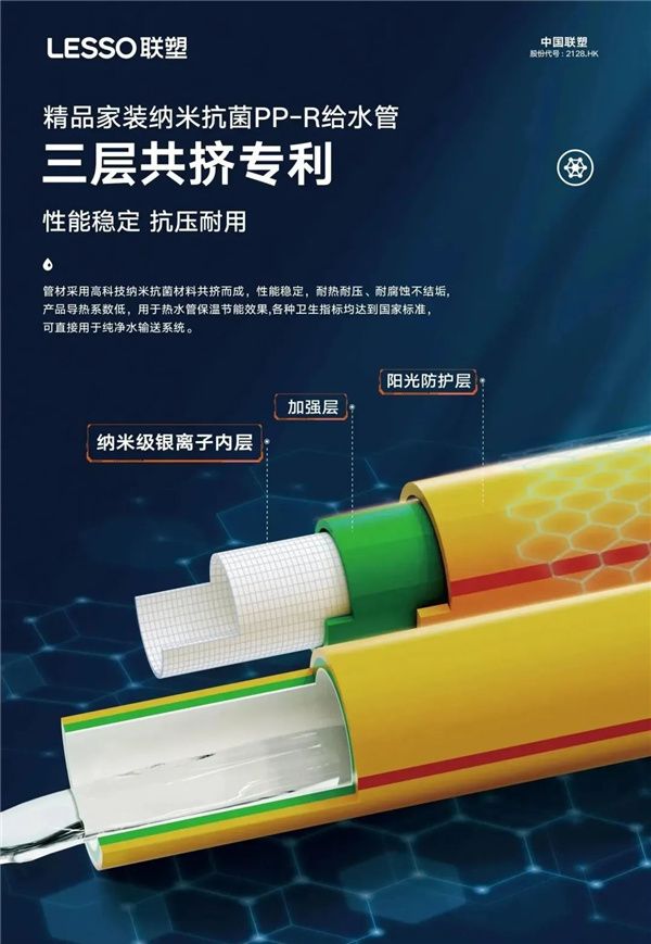 联塑纳米系列抗菌PP-R给水管,内外三层,集抑菌、耐腐蚀、不结垢等优点于一身,有效抑制细菌,藻类滋生,为居家生活用水的增添一道卫生防线,呵护家人健康。