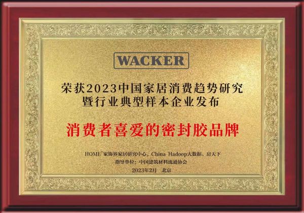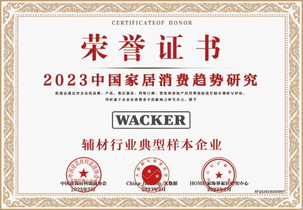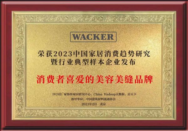 在中国建筑材料流通协会的指导下,HOME家饰界联合China Hadoop大数据、房天下于二月在京发布“2023中国家居消费趋势研究暨行业典型样本企业成果”,经过综合调研与评估,瓦克被授予“辅材行业典型样本企业”荣誉证书,并同时获评“消费者喜爱的密封胶品牌”、“消费者喜爱的厨卫防霉品牌”及“消费者喜爱的美容美缝品牌”等称号。