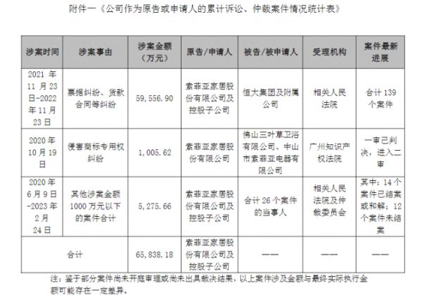 2023年2月28日,索菲亚(002572.SZ)发布关于累计诉讼、仲裁案件情况的公告,截止2023年2月28日,公司及控股子公司连续十二个月内累计发生的诉讼、仲裁事项的涉案金额共计人民币71,871.97万元。