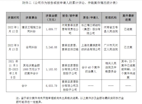 据悉,本次披露的诉讼、仲裁案件情况中,公司及控股子公司不存在单项涉案金额占公司最近一期经审计净资产绝对值10%以上,且绝对金额超过人民币1000万元的重大诉讼、仲裁事项。鉴于部分案件尚未开庭审理或尚未结案,部分案件尚未执行完毕,上述诉讼事项对公索菲亚本期利润或期后利润的影响具有不确定性。
