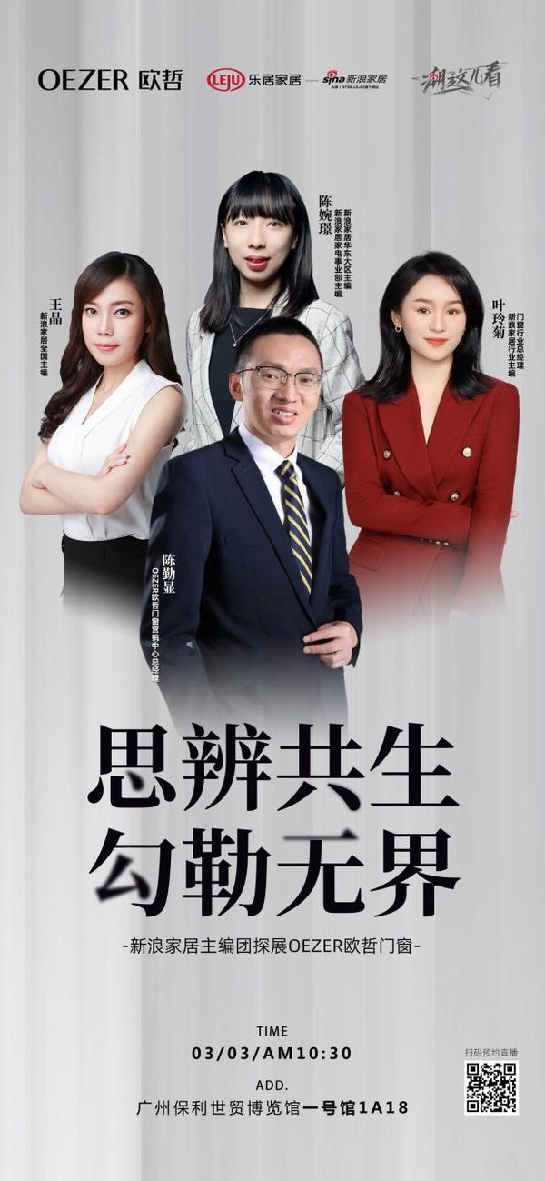 3月3日上午,由新浪家居行业主编、门窗行业总经理叶玲菊,新浪家居全国主编,新浪家居家电事业部主编、华东大区主编陈婉璟组成的“潮这儿看”主编团将走进派OEZER欧哲门窗,以“思辨共生 勾勒无界”为主题,从行业、设计和媒体视角,剖析行业新趋势,揭开欧哲“消失的建筑”的秘密,展现未来人居新形态的同时,为消费者展示前沿的时尚元素和家居潮流。