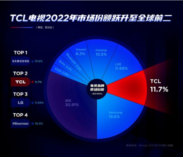 值得注意的是,日前权威调研机构Omdia公布了2022年全球电视出货量报告,数据显示:2022年TCL电视全球销量已经超越LG,跃居全球第二,全年销量市占率提升0.2个百分点,达到11.7%;市占率自2019年至今持续提升,提升幅度达到28%,并连续第四年成为国产电视销量第一。