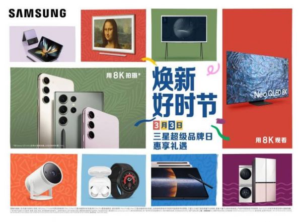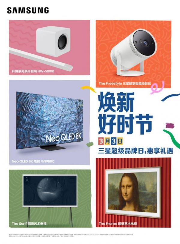 3月3日,三星超级品牌日促销活动强势来袭,包括三星Neo QLED系列电视、Lifestyle艺术系列电视等在内的全品类多款产品惠享礼遇在三星商城等线上线下指定渠道同步开启。在这个春暖花开的季节,三星集合强大音影设备,焕新你的视听体验,为你开启春日居家好时光。