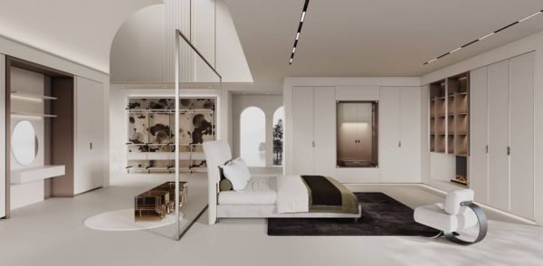 如在卧室空间,“花火”系列摒弃了过去为了追求风格统一,却导致造型单一的设计思路,在一个空间中,结合应用了两款主门型,对护墙隔断进行了微造型设计,还将多款造型工艺件融入进来,设计元素虽丰富,但由于贯穿着极具韵味又不失利落的设计思路,使得整体空间既有细节变化,又有视觉统一感。