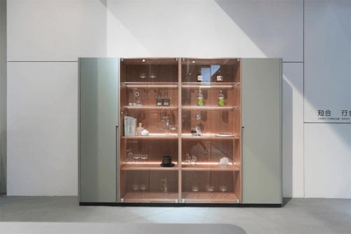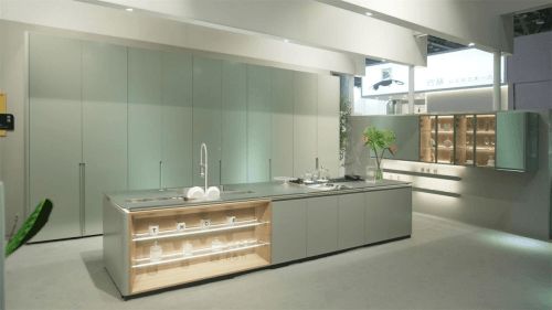 展会上产品的设计走的是极简风,绿色和木纹从视觉上给人健康环保的感觉,再加上我们的产品主材用的是304不锈钢,安全、稳定、环保,在极端环境下也能不发霉不变形,使用寿命远超一般的定制家具。比如这套梵逸橱柜,低饱和度的青山灰在家居中更加养眼耐看,无论是从美观度还是实用性来讲都非常棒,特别适合别墅、大平层这类大户型采用。