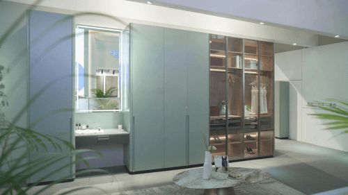 另外为什么延伸至全屋,因为现在大家更喜欢家居统一风格。我们学习借鉴了国际化的设计理念,不断追求更美的设计,更美的产品。比如说衣柜,截断式太常见而且不够大气,而业内许多厂家都做不出高柜,多需要辅助调直器,THOR索而就突破了这一点,我们是业内罕有且较早做出三米高柜门的品牌,甚至不需要加传统的调直器。