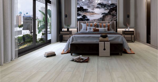 白色系地板在北欧风格中很常见,它可以增加室内的亮度,让空间更显纯净恬淡之感。白色地板与新中式空间也十分契合。清新纯净的白色地板更能彰显新中式空间古朴优雅的气质,让房间透出一股清澈悠远之感。卢森地板雪朗橡木是淡雅的白色调地板,它的肌理也十分细腻自然。在新中式空间中可以呈现出一种舒缓平静的质感。床头背景山水画,增添了空间的艺术底色,中式宁静致远的韵味徐徐传达,让人们暂时远离城市的喧嚣,回归心内的平静。
