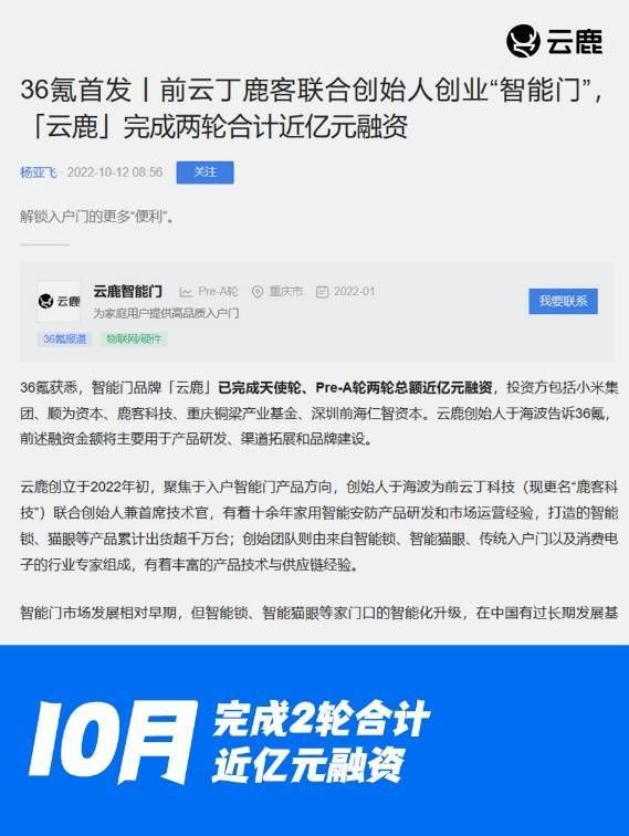 其中有个品牌不容忽视,云鹿,作为小米供应链上的智能门品牌,目前已获两轮融资。小米集团、顺为资本、鹿客科技、重庆铜梁产业基金、深圳前海仁智资本均在资方之列。