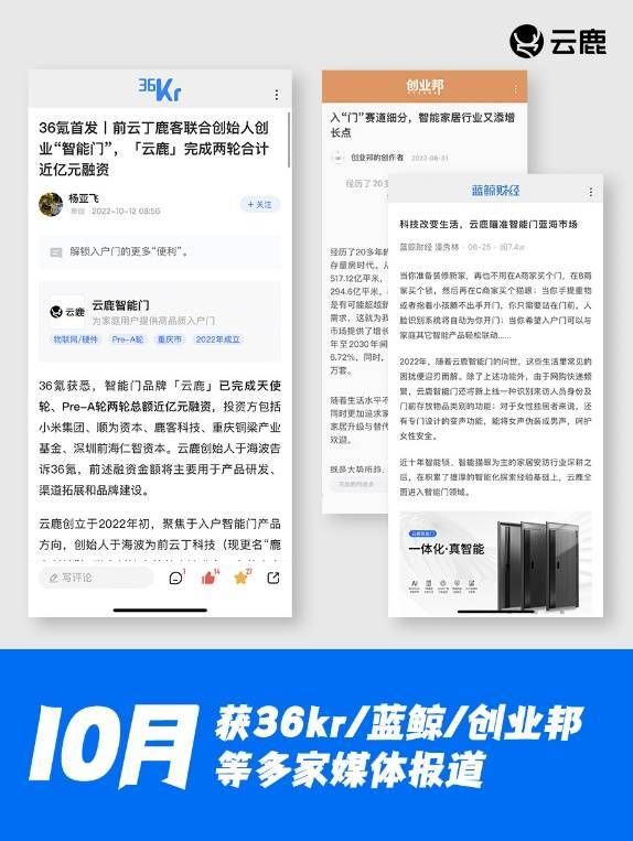 多家科技、财经领域前沿媒体对云鹿进行专题报道,使云鹿获更多业内认可,同时被更多消费者广泛熟知,包括科技创投媒体36氪、蓝鲸财经、界面新闻、创业邦等多家媒体。