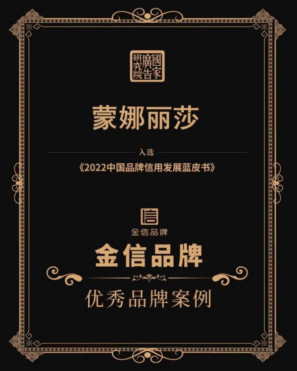 2023年3月4日,2023年度中国品牌信用金信奖在中国品牌信用建设论坛上揭晓。蒙娜丽莎以其在品牌信用建设工作上取得的骄人成绩,入选《2022中国品牌信用发展蓝皮书》优秀品牌案例,并荣获“金信品牌”奖。