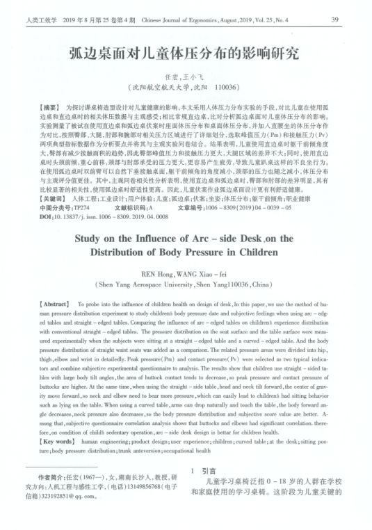 [1]任宏.王小飞.弧边桌面对儿童体压分布的影响研究[J].人类工效学,2019(4):39-42