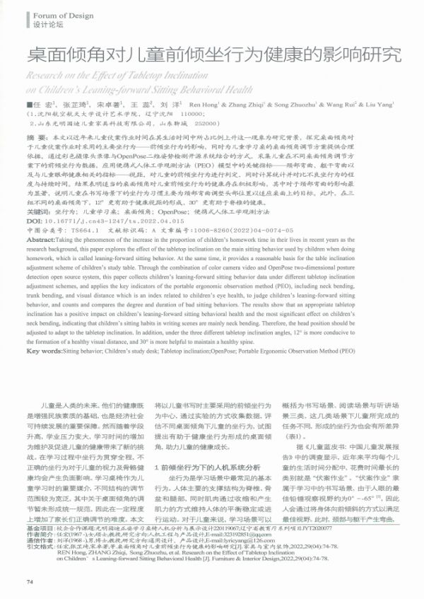 [2]任宏.张芷琦.桌面倾角对儿童前倾坐行为健康的影响研究[J].家具与室内装饰,2022(4):74-78