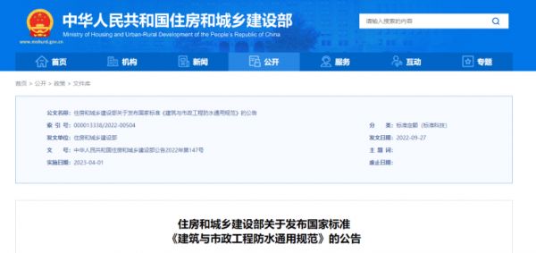 自2023年4月1日起,住建部发布的《建筑与市政工程防水通用规范》将开始正式实施。本规范为强制性工程建设规范,全部条文必须严格执行,同时废止了一大批现行工程建设标准相关强制性条文。从规范看,防水新规提升了防水年限、重新定义了防水等级、提高了防水材料耐久性能要求、增加了防水道数、规定了材料最小厚度,以此全面提升防水工程质量;具体看,与现行防水标准要求保修期5年相比,新规大幅提高防水设计年限,如屋面工程一律提升为不低于20年、室内工程不低于25年、地下工程不低于工程结构设计工作年限。