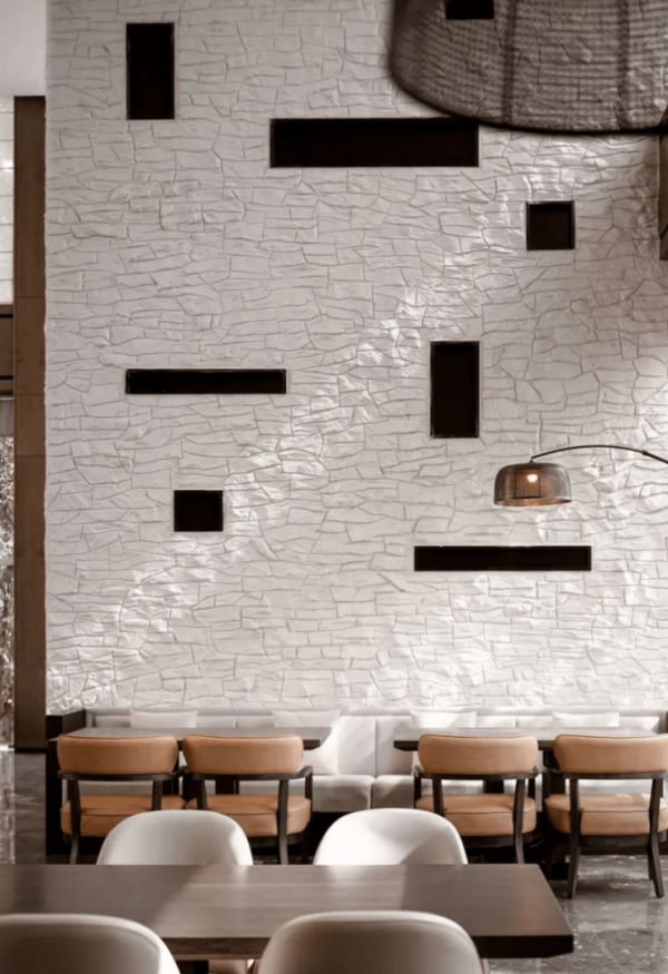 接待大堂江河设计JHD希望将故事从自然生态过渡到对于迷人的地域风情。通过对当地的充分调研,江河设计JHD保留了藏式迷人的色彩印象,用当下工艺去诠释藏式的边玛墙、融合极具天然质感的薄石材板,同时将地域元素、文化进行提炼整理点缀到空间中。同时创造性在首层接待大堂空间中置入画廊,画廊中的画作均为艺术家为酒店创作的系列作品,将酒店的历史风貌及地域风情展示出来。