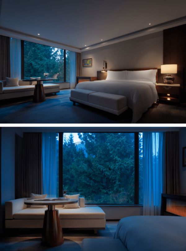 客房区域考虑酒店优越的自然环境及酒店项目造价控制的原因,通过对藏式色彩及元素充分的提炼,客房在刻画上没有使用过多的复杂元素,而是将人自然的引导至窗外去经受当地优美自然风光的洗礼。