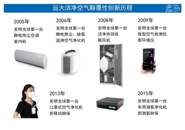 自成立至今,始终坚持自主创新的远大空气在2005年研发了全球第一台静电除尘空气净化器;2008年,自主研发第一台99.9%过滤PM2.5的热回收洁净新风机;此后,第一台微型空气检测仪(环境仪)、第一台口罩式空气净化器(移动肺保)、第一台车用测氧净化器(测氧肺保)相继在远大空气诞生。远大空气逐渐发展成为国内空气净化领域专业技术最强、产品线最全的首屈一指的行业品牌。