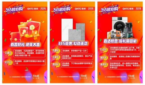 2023年3月1日-3月19日,315放心购精工好物节活动火热进行中,砖属特惠、家电豪礼强势来袭,全国强辉终端门店以势不可挡的姿态出发,燃爆终端!